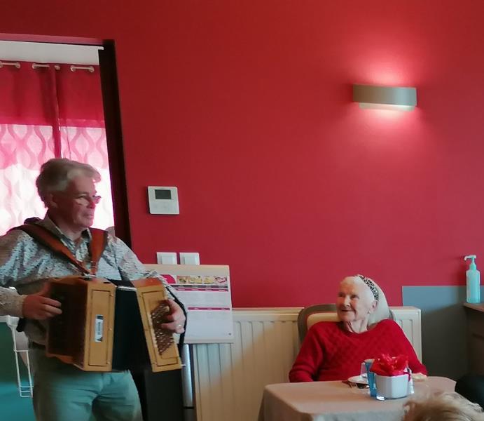 Ce mardi 28 Mars, Monsieur Rondeau est venu jouer de l'accordéon pendant le déjeuner et a poursuivi sa prestation dans l'après-midi, pour célébrer les fêtes d'anniversaires du mois. Chansons populaires, accordéon et déguisements ont rythmé cet après midi bien festif. Les résidents ont beaucoup apprécié ce bon moment partagé avec l'intervenant et les salariés.