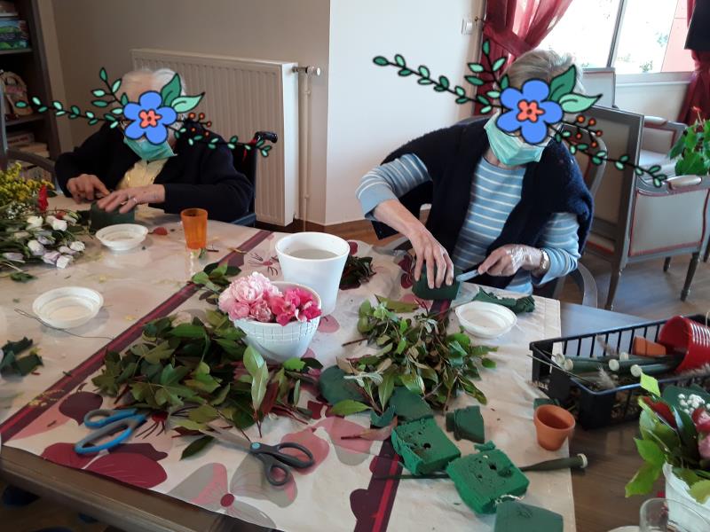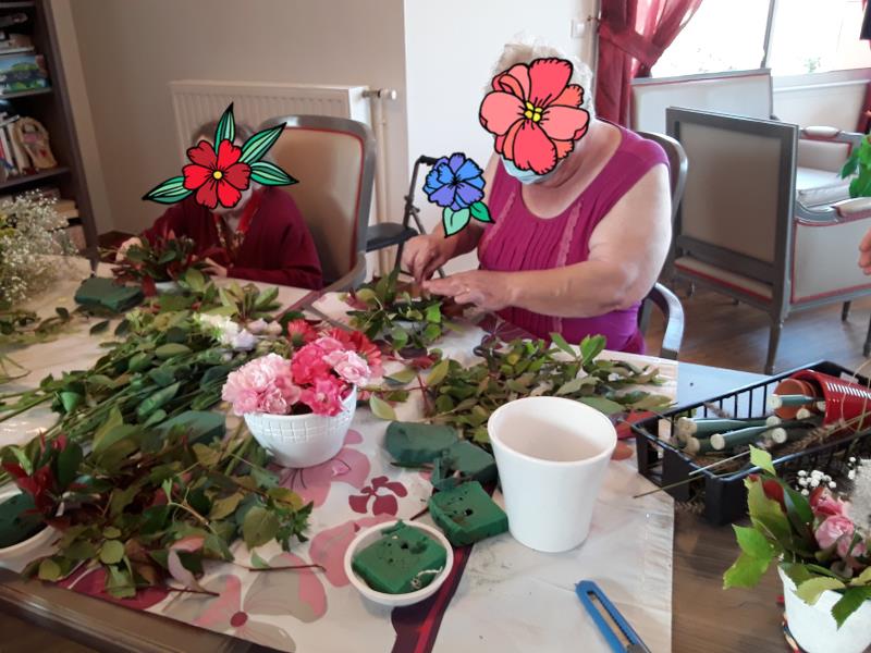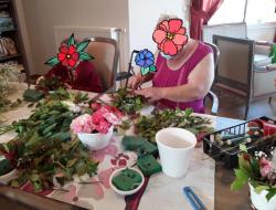 A l'occasion de la fête du 14 juillet, les résidents ont réalisé de superbes compositions florales pour déposer sur les tables. Un travail appliqué et un résultat remarquable.